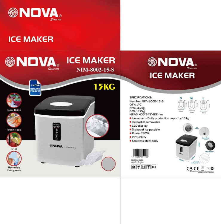 برند : نوا ظرفیت : ۱۵ کیلوگرم در روز تنظیم سایز : قابل تنظیم در سه سایز توان : ۱۳۰ وات جنس بدنه : استیل ضد زنگ 406*343*422 میلیمت بسکت یخ قابل جدا کردن دارد ساخت کشور : چین